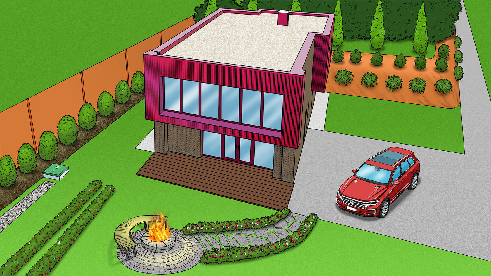 Активно применяется в современных полуоткрытых фасадах с элементами планкена.